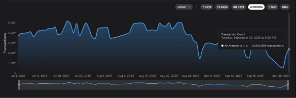 Laut Nansen deuten die Blockchain-Daten von Avalanche auf eine erhebliche Nutzeraktivität hin, die im Durchschnitt über 1.000.000 Transaktionen pro Tag beträgt, mit einem Höchstwert von 51.600.000 Transaktionen pro Tag im letzten Quartal.