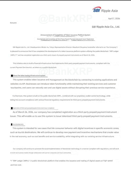 Am 26. März 2026 erhielt SBI Ripple Asia außerdem die offizielle Registrierung als Emittent von Prepaid-Zahlungsinstrumenten. Dieser Schritt ermöglicht es dem Unternehmen, tokenisierte Instrumente direkt über sein XRPL-basiertes System auszugeben.