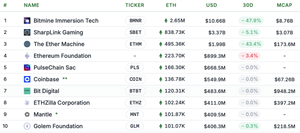 Die Ankündigung erfolgt, während BitMine Immersion Technologies seine Ethereum-Reserven auf 2,65 Millionen im Wert von über 11 Milliarden US-Dollar erhöht. Das Unternehmen baut damit seinen Vorsprung vor dem zweitplatzierten SharpLink Gaming aus, das über knapp über 838.000 ETH verfügt.