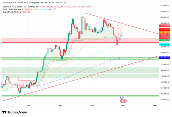 Sollte es nicht gelingen, die Dynamik wiederzugewinnen, wird der ETH-Squeeze blockiert, sodass 4.120 $ und 3.874 $ als wichtige Verteidigungsniveaus verbleiben. Analysten bleiben vorsichtig optimistisch, solange ETH über 4.120 $ notiert. Die Reaktion bei 4.359 $ wird jedoch darüber entscheiden, ob der Oktober mit einem Ausbruch oder einer weiteren Konsolidierungsphase beginnt.
