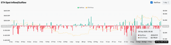 - Der Verkauf von ETH durch BlackRock im Wert von 205 Millionen US-Dollar verstärkt den Verkaufsdruck, obwohl die Abflüsse aus der Börse am 30. September 35,8 Millionen US-Dollar erreichten.