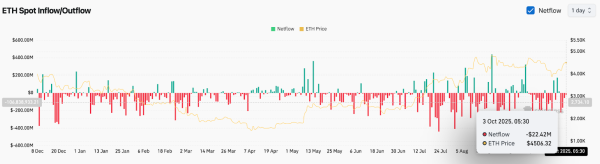 Börsendaten zeigen einen Nettoabfluss von 22,4 Millionen US-Dollar am 3. Oktober. Dies deutet auf eine leichte Anhäufung von Geldern hin, da ETH von 4.500 US-Dollar zurückging. Dies deutet zwar darauf hin, dass sich die Käufer auf einen Rückgang einstellen, der Abfluss bleibt jedoch im Vergleich zur Phase der aktiven Anhäufung im Juli ungleichmäßig.