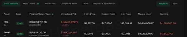- Ethereum – Long mit 15-fachem Hebel. Die aktuellen Verluste übersteigen 10 Millionen US-Dollar;
