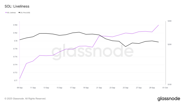 On-Chain-Daten zeigen wachsenden Pessimismus unter Langzeitinhabern (LTHs). Solanas Liveliness-Kennzahl ist in den letzten Wochen stark angestiegen, was auf eine Zunahme der Coins hindeutet, die ruhende Wallets verlassen. Dies deutet darauf hin, dass LTHs ihre Vermögenswerte verkaufen, was das Vertrauen schwächt und den Preis des Altcoins unter Druck setzt.