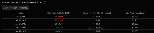 - Am 28. April wurden 89,68 Millionen Dollar aus Bitcoin-ETFs abgezogen, wobei Blackrock IBIT mit Abhebungen in Höhe von 112,25 Millionen Dollar führend war.