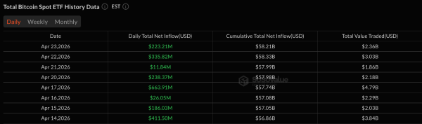Bitcoin setzte seinen Aufwärtstrend fort, Ethereum hingegen nicht. Krypto-ETFs verzeichneten am Donnerstag, dem 23. April, erneut ein uneinheitliches Handelsergebnis, was verdeutlicht, dass der Markt zwar weiterhin wächst, aber nicht mehr synchron verläuft. Bitcoin baute seine Gewinne aus, Ethereum fiel zurück, während kleinere Vermögenswerte weiterhin selektiv nachgefragt wurden.