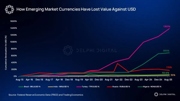 Ein Vergleich der Währungen der Schwellenländer, die gegenüber dem US-Dollar an Wert verlieren. Quelle: Delphi Digital