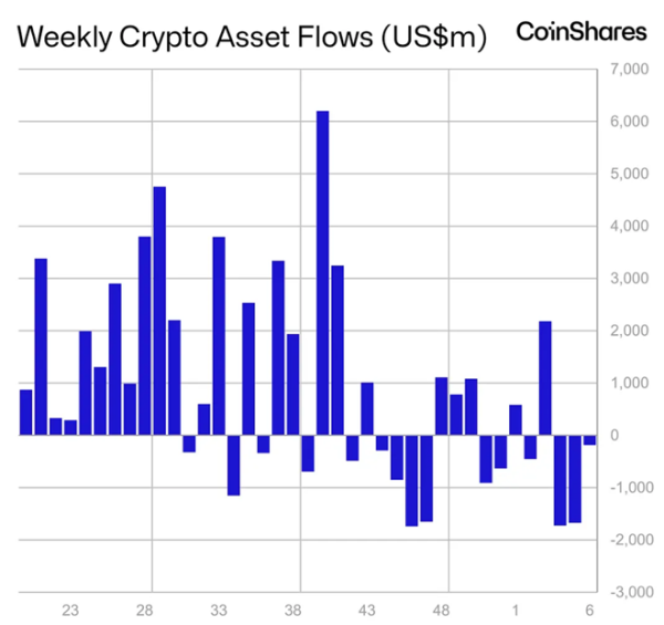 Laut CoinShares beliefen sich die Abflüsse aus auf Kryptowährungen basierenden börsengehandelten Produkten (ETPs) vom 31. Januar bis zum 6. Februar auf insgesamt 187 Millionen US-Dollar.