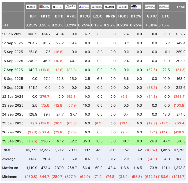 Die Rückkehr der Mittel in ETFs erfolgt, während sich der Kryptomarkt von der September-Korrektur erholt. In den letzten zwei Tagen ist Bitcoin um 4,5 % gestiegen, während Ethereum um 6,5 % zulegte.