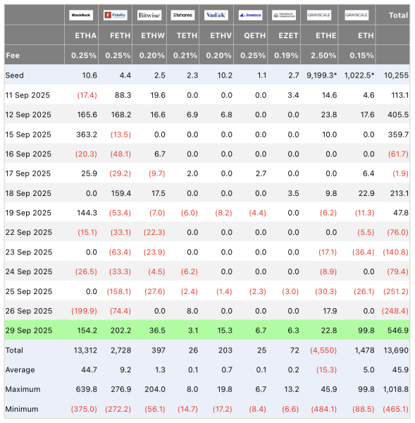 Neun Ethereum-ETFs beendeten ihre fünftägige Abflussserie und verzeichneten einen Gesamtzufluss von 547 Millionen US-Dollar. Laut SoSoValue war der Fidelity Ethereum Fund (FETH) führend und sammelte allein 202 Millionen US-Dollar ein. Auch der iShares Ethereum Trust (ETHA) von BlackRock folgte diesem Beispiel mit 154 Millionen US-Dollar an einem einzigen Tag.