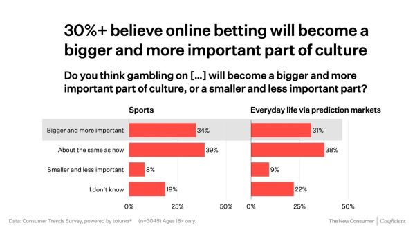 Laut einer Umfrage von The New Consumer und Coefficient Capital, für die über 3.000 US-Bürger befragt wurden, glaubt ein Drittel der jungen Amerikaner, dass Prognosemärkte die Zukunft sind und nutzt sie aktiv.