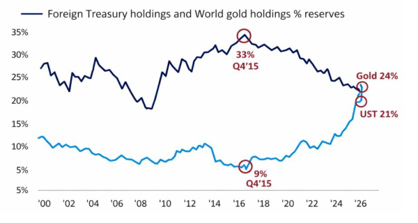 Im vierten Quartal 2015 fiel der Anteil von Edelmetallen an den Zentralbankreserven auf einen Tiefststand von 9 %, während der Anteil von Wertpapieren im Gegenzug auf einen Höchststand von 33 % stieg. In der Folge begannen die Zentralbanken jedoch, ihre XAU-Reserven aufzustocken und Anleihen zu veräußern. Daher übertraf Gold im April 2026 erstmals seit Mitte der 1990er-Jahre den Anteil von Wertpapieren an den Reserven – 24 % gegenüber 21 %.