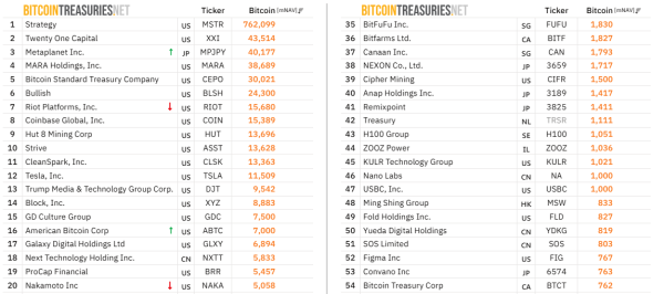 Börsennotierte Unternehmen, die Bitcoin halten. Quelle: Bitcoin Treasurys