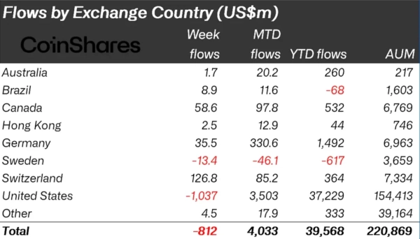 Regional verzeichneten die USA mit -1 Milliarde US-Dollar den größten Abfluss. Andere Regionen zeigten sich widerstandsfähig: Die Schweiz (126,8 Millionen US-Dollar), Kanada (58,6 Millionen US-Dollar) und Deutschland (35,5 Millionen US-Dollar) führten den Zufluss an.