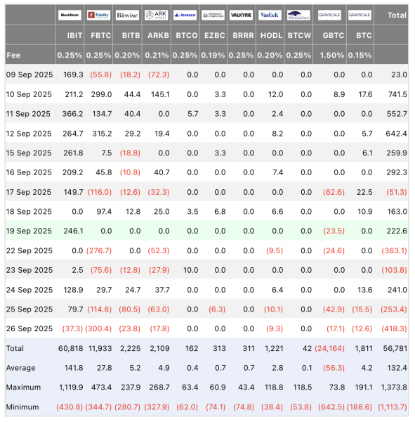 Spot-Bitcoin-ETFs verzeichneten sogar noch größere Abflüsse: 902,5 Millionen Dollar in einer Woche über alle verfügbaren Fonds hinweg. Der 26. September war ein schwarzer Tag für Bitcoin-ETFs: Anleger zogen 418,3 Millionen Dollar ab – der höchste Tagesabfluss seit Mitte August.