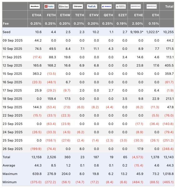 Der 25. und 26. September waren besonders schwierige Tage für Ethereum-ETFs. Als der Preis der Kryptowährung unter 4.000 Dollar fiel, verloren die Fonds täglich rund 250 Millionen Dollar. Einen solchen zweitägigen Abfluss hatte es seit Mitte August nicht mehr gegeben.