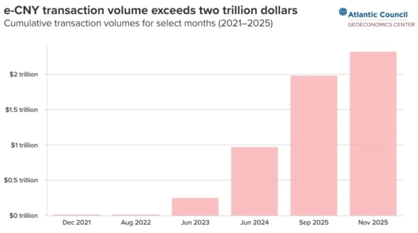 Laut Atlantic Council ist das Transaktionsvolumen des digitalen Yuan seit dem Start des Pilotprojekts im Jahr 2023 um mehr als 800 % gestiegen und hat 2,3 Billionen US-Dollar überschritten.