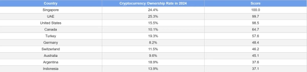 Singapur belegte mit einer Gesamtpunktzahl von 100 den ersten Platz. 24,4 % der Bevölkerung besitzen Kryptowährungen und Singapur ist mit 2.000 kryptowährungsbezogenen Suchanfragen pro 100.000 Einwohnern weltweit führend bei der Suchaktivität. Im Jahr 2021 besaßen nur 11 % der Singapurer digitale Vermögenswerte, doch im darauffolgenden Jahr hatte sich diese Zahl mehr als verdoppelt.